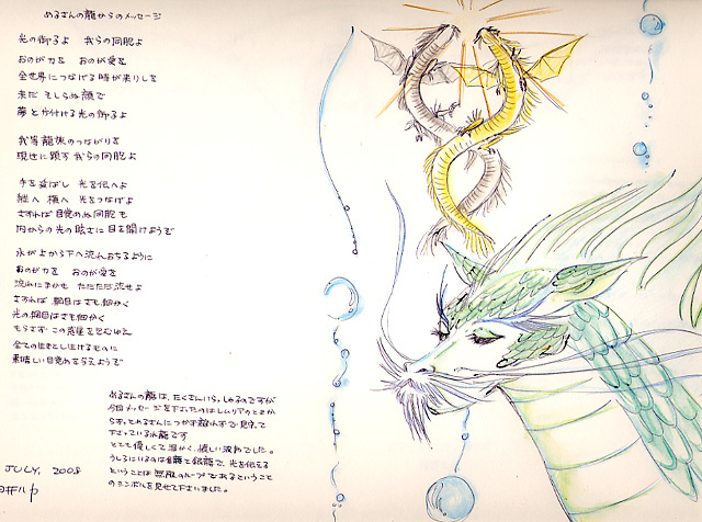☆める・りんすさんの天使からのメッセージ ←前のイラスト 次のイラスト→ ![]() 【クリックしてイラストイメージを拡大】 ---める・りんすさんへのチャネリングメッセージ--- 光の御子よ、我らの同胞よ おのが力を、おのが愛を 全世界につなげる時が来りしを 未だそしらぬ顔で 夢と片付ける光の御子よ 我ら竜族のつながりを 現世に顕す我らの同胞よ 手を伸ばし、光を伝へよ 縦へ横へ、光をつなげよ さすれば目覚めぬ同胞も 内からの光の眩しさに目を開けようぞ 水が上から下へ流れおちるように おのが力を、おのが愛を 流れに任せ、ただただ流せよ さすれば網目はさも細かく 光の網目はさも細かく もらさずこの惑星を包むゆえ 全ての生きとし生けるものに 素晴らしい目覚めを与えようぞ ### めるさんの龍はたくさんいらっしゃるのですが、今回メッセージを 下さったのはレムリアの時からずっとメルさんにつかず離れずで見守ってくださっている水龍です。 とても優しくて温かく、懐かしい波動でした。 後ろにいるのは金龍と銀龍で、光を伝えるということは無限のループである、ということのシンボルを見せてくださいました。 ---める・りんすさんからいただいた感想--- 今回のメッセージをくれた水色の龍。大きく描かれたその顔と雰囲気は私自身懐かしさと「知ってる〜!!」という思いがあふれて、嬉しい驚きでした。 普段よく一緒に何かをしてくれるのは後ろで∞のマークを作っている金龍と銀龍のようです。 (ただ私のイメージでは羽はありませんが・・・でも羽があるのもかっこいいですね) メッセージの中の 「全世界につなげるときが来たりしを 未だそ知らぬ顔で 夢と片付ける光の御子よ」 という部分。ドッキーン 「そ知らぬ顔で夢と片付ける」なんて、どどど・・・どうしてそれをたらーっ(汗) 龍についてもっといろいろと伝えたいことがあるのだけど、なかなか書く時間が確保できずにいます。きっと彼らもそんな私がもどかしいのね。 素敵な言葉をありがとう。普段から彼らの言いたいことは感じてはいても、こうして目に見える「ことば」となって届くと(その上イラストというイメージがついてくるからなおさら)とても心に響きました。 心より白井ルカさんに感謝します、ありがとう。 世界にたった一つしかない、守護天使からあなたのためだけに贈られるスピリチュアル・ギフトのお申込は、今すぐこちらからどうぞ♪ ←前のイラスト 次のイラスト→ |
